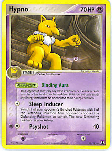 Evne [C] Sleep Inducer - Switch 1 of your opponent's Benched Pokemon with 1 of the Defending Pokemon. Your opponent chooses the Defending Pokemon to switch. The new Defending Pokemon is now Asleep.