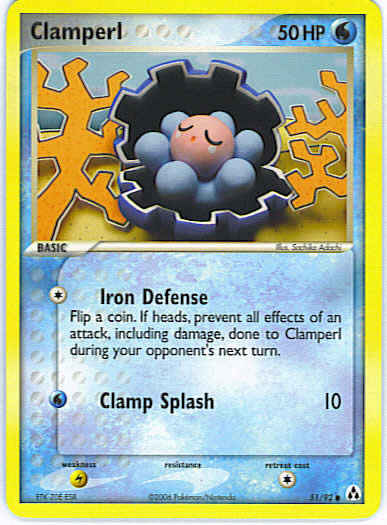 Evne2[C] Iron Defense - Flip a coin. If heads, prevent all effects of an attack, including damage, done to Clamperl during your opponent's next turn.