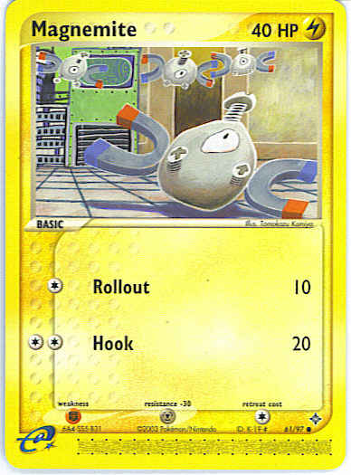 | Type | Lightning | | Pokemon serie | Dragon | | Stadie | Basic | | HP | 40 | | Sjældenhed | Common | | Tilbagetrækning | 1 | | Modstand | M | | Svaghed | F | | Kortnummer | 61 | | Evne | [C] Rollout (10) [CC] Hook (20) | | Evne2 | [C] Rollout (10) [CC] Hook (20) | | Kunstner | Tomokazu Komiya |