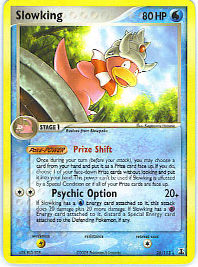 Evne [CC] Psychic Option (20+) If Slowking has a W Energy card attached to it, this attack does 20 damage plus 20 more damage. If Slowking has a P Energy card attached to it, discard a Special Energy card attached to the Defending Pokemon, if any.