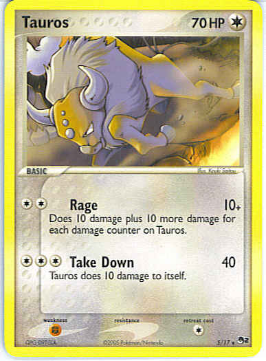 | Type | Colorless | | Pokemon serie | OP Series 2 | | Stadie | Basic | | HP | 70 | | Sjældenhed | Rare | | Tilbagetrækning | 1 | | Svaghed | F | | Kortnummer | 5 | | Evne | [CC] Rage (10+) Does 10 damage plus 10 more damage for each damage counter on Tauros. [CCC] Take Down (40) Tauros does 10 damage to itself.