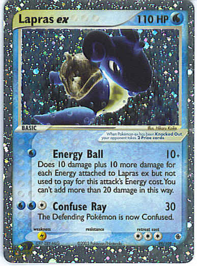 | | Evne2 | [W] Energy Ball (10+) Does 10 damage plus 10 more damage for each Energy attached to Lapras ex but not used to pay for this attack's Energy cost. You can't add more then 20 damage in this way. [CWW] Confuse Ray (30) The Defending Pokemon is now Confused.