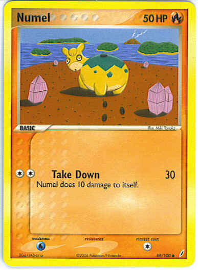 | Type | Fire | | Pokemon serie | Crystal Guardians | | Stadie | Basic | | HP | 50 | | Sjældenhed | Common | | Tilbagetrækning | 1 | | Svaghed | W | | Kortnummer | 59 | | Evne | [CC] Take Down (30) Numel does 10 damage to itself. | | Evne2 | [CC] Take Down (30) Numel does 10 damage to itself. | | Kunstner | Miki Tanaka |