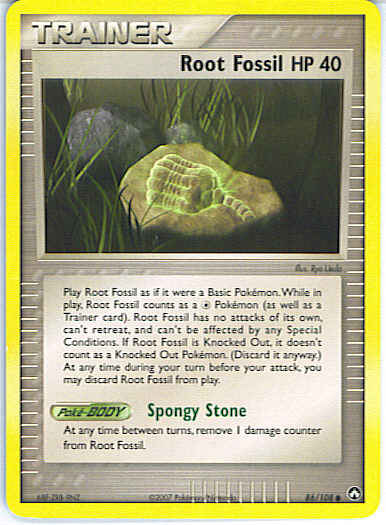 Play Root Fossil as if it were a Basic Pokemon. While in play, Root Fossil counts as a C Pokemon (as well as a Trainer card). Root Fossil has no attacks of its own, can't retreat, and can't be affected by any Special Conditions. If Root Fossil is Knocked Out, it doesn't count as a Knocked Out Pokemon. (Discard it anyway.) At any time during your turn before your attack, you may discard Root Fossil from play.