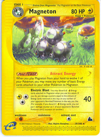 | Type | Metal | | Pokemon serie | Skyridge | | Stadie | Stage 1 | | HP | 70 | | Sjældenhed | Rare | | Tilbagetrækning | 2 | | Modstand | G | | Svaghed | R | | Kortnummer | 19 | | Evne | [CC] Bounce Off (20) If Magneton and the Defending Pokemon don't have the same number of Energy cards attached to them, the player controlling the Active Pokemon with the fewest number of Energy cards attached to it switches 1 of his or her Benched Pokemon with his or her Active Pokemon. [CMM] Magnetic Wave (30+) This attack does 30 damage plus 10 more damage times the number of your Benched Pokemon minus the number of your opponent's Benched Pokemon. (For example, if your opponent has 1 Benched Pokemon and you have 3, this attack will do 30 damage plus 20 more damage.)