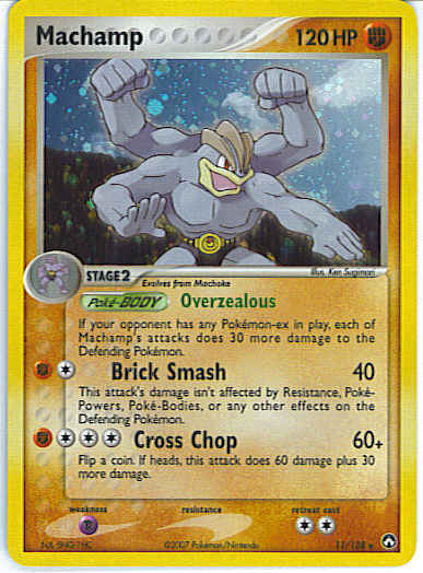 | Type | Fighting | | Pokemon serie | Power Keepers | | Stadie | Stage 2 | | HP | 120 | | Sjældenhed | Rare | | Tilbagetrækning | 2 | | Svaghed | P | | Kortnummer | 11 | | Evne |
