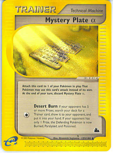 Evne2[C] Desert Burn - If your opponent has 5 or more Prizes, search your deck for a Trainer card, show it to your opponent, and put it into your hand. If your opponent has only 1 Prize, the Defending Pokemon is now Burned, Paralyzed, and Poisoned.
