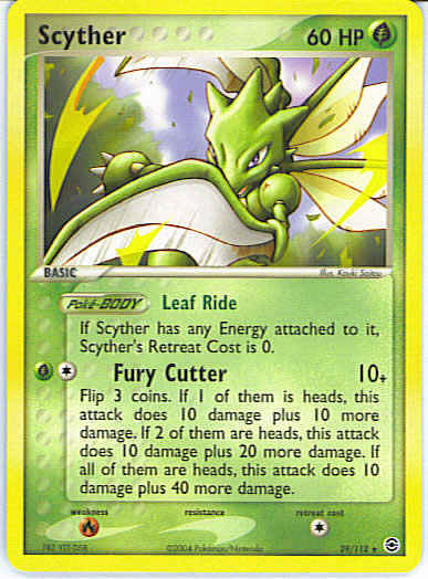 Evne2[CG] Fury Cutter (10+) Flip 3 coins. If 1 of them are heads, this attack does 10 damage plus 10 more damage. If 2 of them are heads, this attack does 10 damage plus 20 more damage. If all of them are heads, this attack does 10 damage plus 40 more damage.