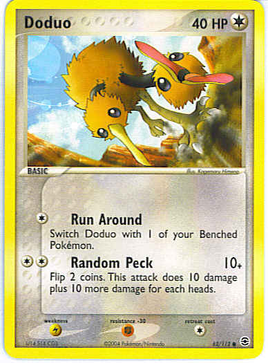 | Type | Colorless | | Pokemon serie | Fire Red Leaf Green | | Stadie | Basic | | HP | 40 | | Sjældenhed | Common | | Tilbagetrækning | 1 | | Modstand | F | | Svaghed | L | | Kortnummer | 62 | | Evne | [C] Run Around - Switch Doduo with 1 of your Benched Pokemon. [CC] Random Peck (10+) Flip 2 coins. This attack does 10 damage plus 10 more damage for each heads. | | Evne2 | [C] Run Around - Switch Doduo with 1 of your Benched Pokemon. [CC] Random Peck (10+) Flip 2 coins. This attack does 10 damage plus 10 more damage for each heads. | | Kunstner | Kagemaru Himeno |