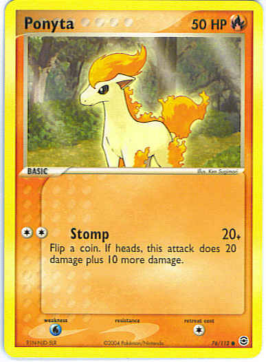 | Type | Fire | | Pokemon serie | Fire Red Leaf Green | | Stadie | Basic | | HP | 50 | | Sjældenhed | Common | | Tilbagetrækning | 1 | | Svaghed | W | | Kortnummer | 76 | | Evne | [CC] Stomp (20+) Flip a coin. If heads, this attack does 20 damage plus 10 more damage. | | Evne2 | [CC] Stomp (20+) Flip a coin. If heads, this attack does 20 damage plus 10 more damage. | | Kunstner | Ken Sugimori |