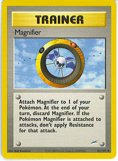 Evne Attach Magnifier to 1 of your Pokemon. At the end of your turn, discard Magnifier. If the Pokemon Magnifier is attached to attacks, don't apply Resistance for that attack.