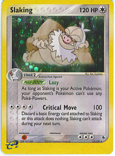 Evne[CCCC] Critical Move (100) Discard a Basic Energy card attached to Slaking or this attack does nothing. Slaking can't attack during your next turn.