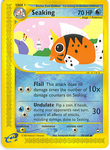 | Type | Water | | Pokemon serie | Aquapolis | | Stadie | Stage 1 | | HP | 70 | | Sjældenhed | Uncommon | | Tilbagetrækning | 1 | | Svaghed | L | | Kortnummer | 59 | | Evne | [CC] Flail (10x) Does 10 damage times the number of damage counters on Seaking. [CCW] Undulate (30) Flip a coin. If heads, during your opponent's next turn, prevent all effects of attacks, including damage, done to Seaking.