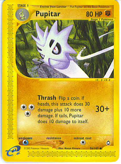 Evne2[CCC] Thrash (30+) Flip a coin. If heads, this attack does 30 damage plus 10 more damage. If tails, Pupitar does 10 damage to itself.