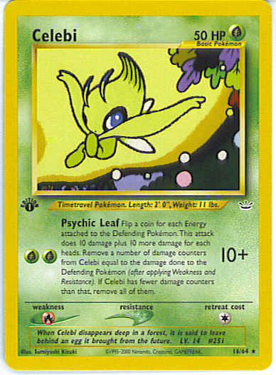 [GG] Psychic Leaf (10+) Flip a coin for each Energy attached to the Defending Pokemon. This attack does 10 damage plus 10 more damage for each heads. Remove a number of damage counters from Celebi equal to the damage done to the Defending Pokemon (after applying Weakness and Resistance). If Celebi has fewer damage counters than that, remove all of them.