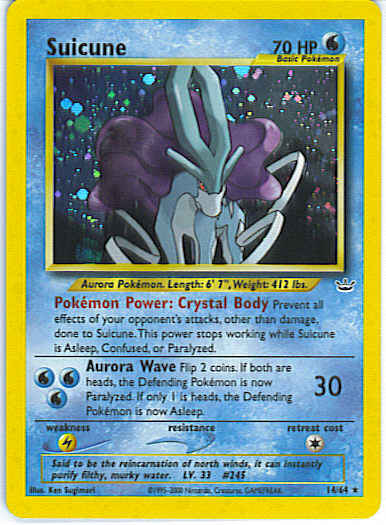 Evne2 of your opponent's attacks, other than damage, done to Suicune. This power stops working while Suicune is Asleep, Confused, or Paralyzed.