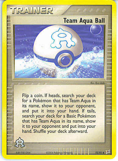 EvneFlip a coin. If heads, search your deck for a Pokemon that has Team Aqua in its name, show it to your opponent, and put it into your hand. If tails, search your deck for a Basic Pokemon that has Team Aqua in its name, show it to your opponent and put into your hand. Shuffle your deck afterward.