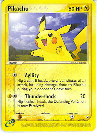 | Type | Lightning | | Pokemon serie | Team Aqua-Team Magma | | Stadie | Basic | | HP | 50 | | Sjældenhed | Common | | Tilbagetrækning | 1 | | Svaghed | F | | Kortnummer | 43 | | Evne | [C] Agility - Flip a coin. If heads, prevent all effects of an attack, including damage, done to Pikachu during your opponent's next turn. [CL] Thundershock (20) Flip a coin. If heads, the Defending Pokemon is now Paralyzed.