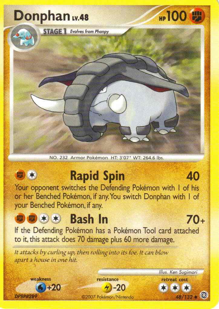 Evne [CF] Rapid Spin (40) Your opponent switches the Defending Pokemon with 1 of his or her Benched Pokemon, if any. You switch Donphan with 1 of your Benched Pokemon, if any.