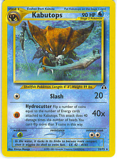 Evne [F] Hydrocutter (40x) Flip a number of coins equal to the number of Energy cards attached to Kabutops. This attack does 40 times the number of heads. You can't flips more than 3 coins in this way.