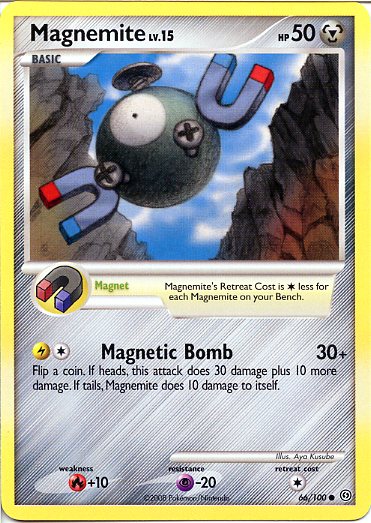 Evne [CL] Magnetic Bomb (30+) Flip a coin. If heads, this attack does 30 damage plus 10 more damage. If tails, Magnemite does 10 damage to itself.