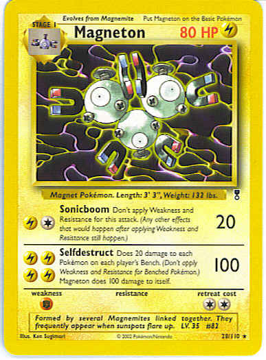 [LLLL] Selfdestruct (100) Does 20 damage to each Pokemon on each player's Bench. (Don't apply Weakness and Resistance for Benched Pokemon.) Magneton does 100 damage to itself.