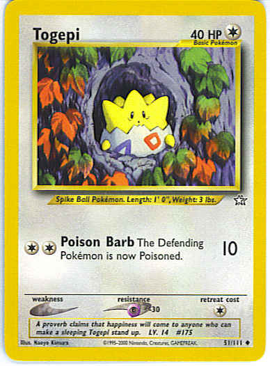 | Type | Colorless | | Pokemon serie | Neo Genesis | | Stadie | Basic | | HP | 40 | | Sjældenhed | Uncommon | | Tilbagetrækning | 1 | | Modstand | P | | Kortnummer | 51 | | Evne |